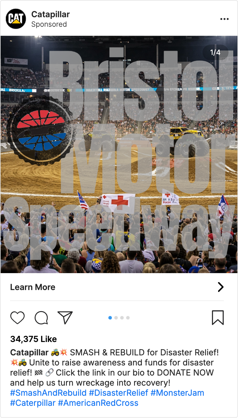 My partner and I developed an idea that really hit close to home in light of the recent Hurricane Helene disasters that impacted Northeast Tennessee. We brought together four different brands—Caterpillar, Monster Jam, Bristol Motor Speedway, and the American Red Cross—to raise awareness for disaster relief efforts.